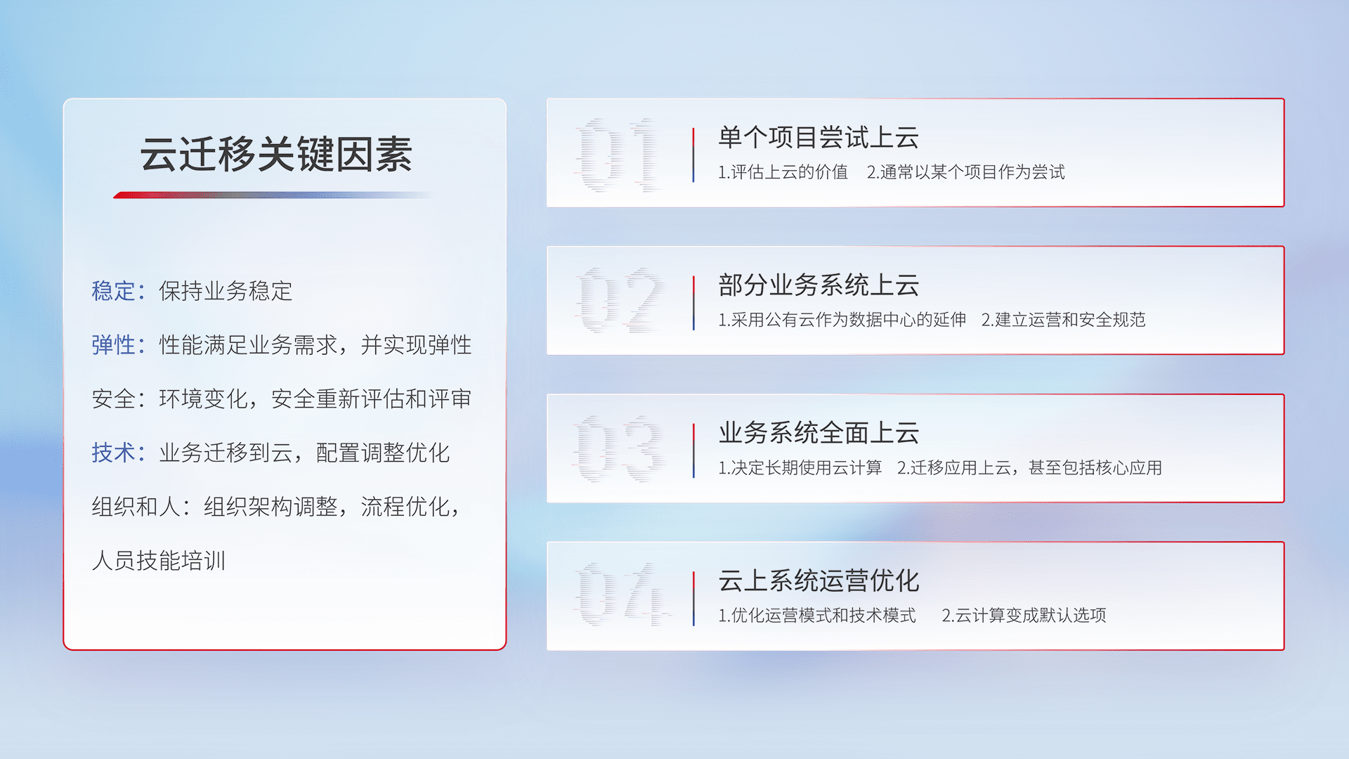 结合实际业务,,,,从规划设计、、、、云平台选型、、、、云原生改造、、、、数据迁移、、集成交付,,,,迁移全过程为客户识别最佳上云路径,,做好风险识别管理,,,,设计网络架构、、身份权限、、、安全审计合规、、操作审计、、、、日志审计、、、监控告警策略、、、、多站点容灾设计等,,,,对云上基础设施进行整体规划,,,,提升IT治理水平,,,,以满足弹性、、高可用、、、、高性能的需求。。。。