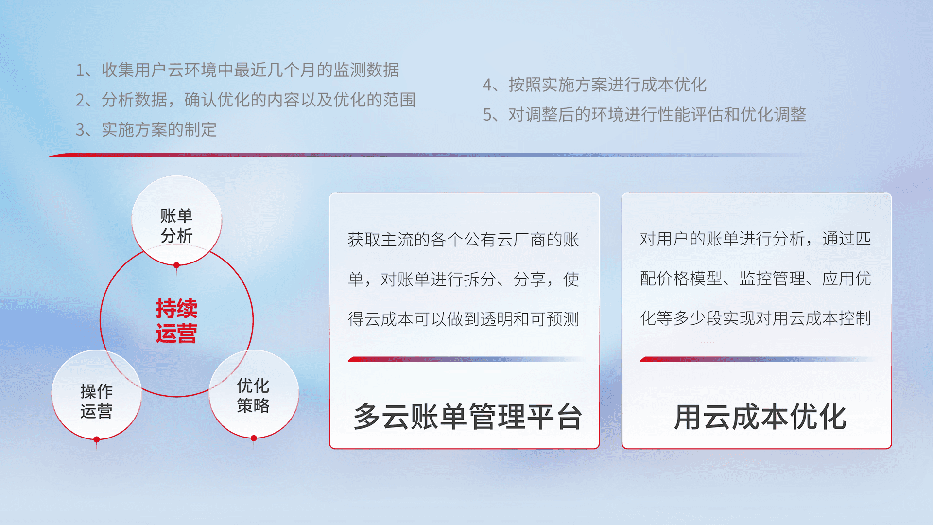 通过多云纳管,,,以统一的资源数据模型把客户的云资源进行抽象和封装,,,进而实现对多云资源的统一操作,,保障云资源管理的可靠性、、稳定性与可用性。。。。量身定制化运维内容,,配置、、、开发运维、、、补丁管理、、、备份、、监控、、、、认证和访问管理、、审计和日常巡检等,,,保障在用云过程中的可靠度,,稳定度以及高可用率。。